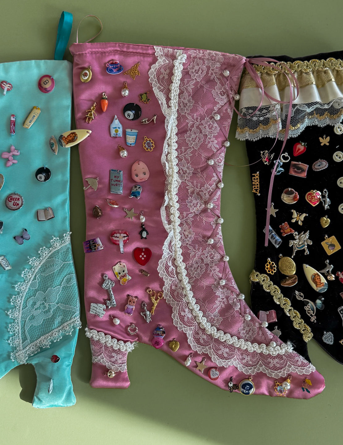One-of-a-kind vintage stocking, adorned with our signature Picto-Charms™ and vintage findings by hand.