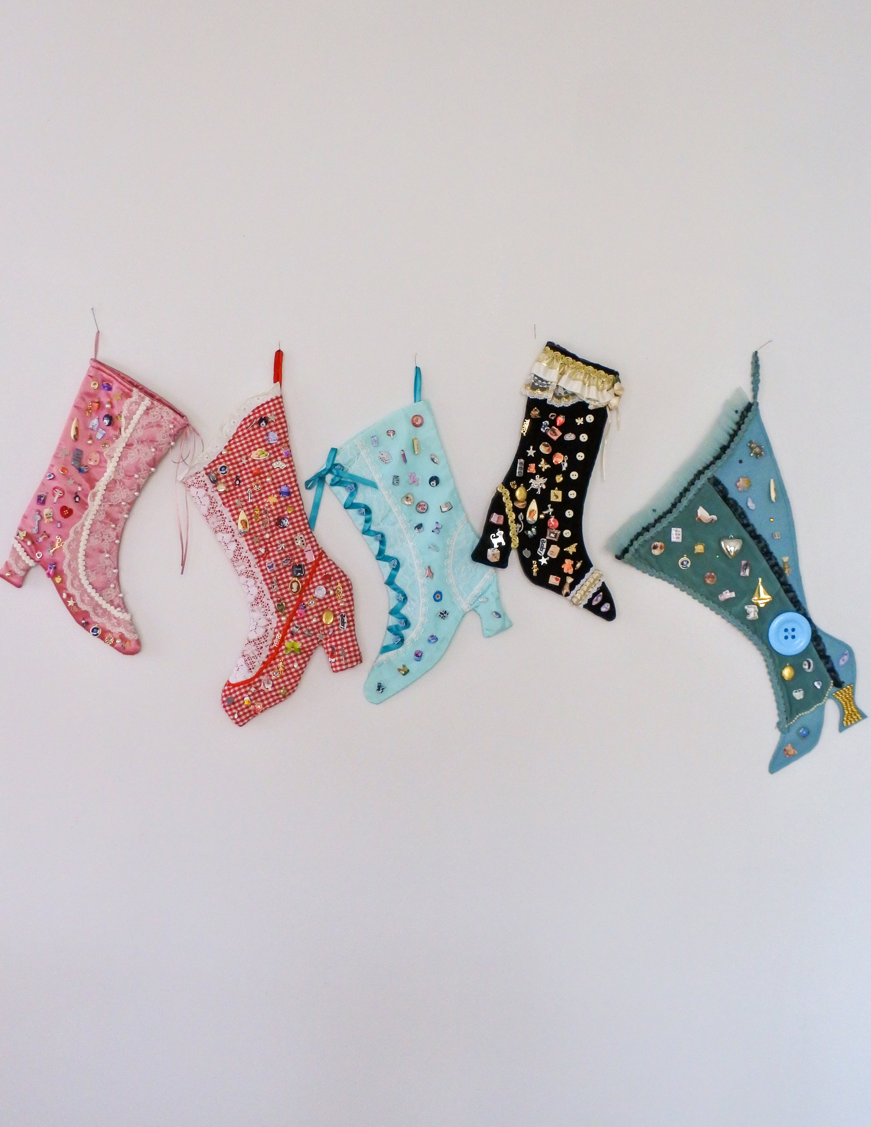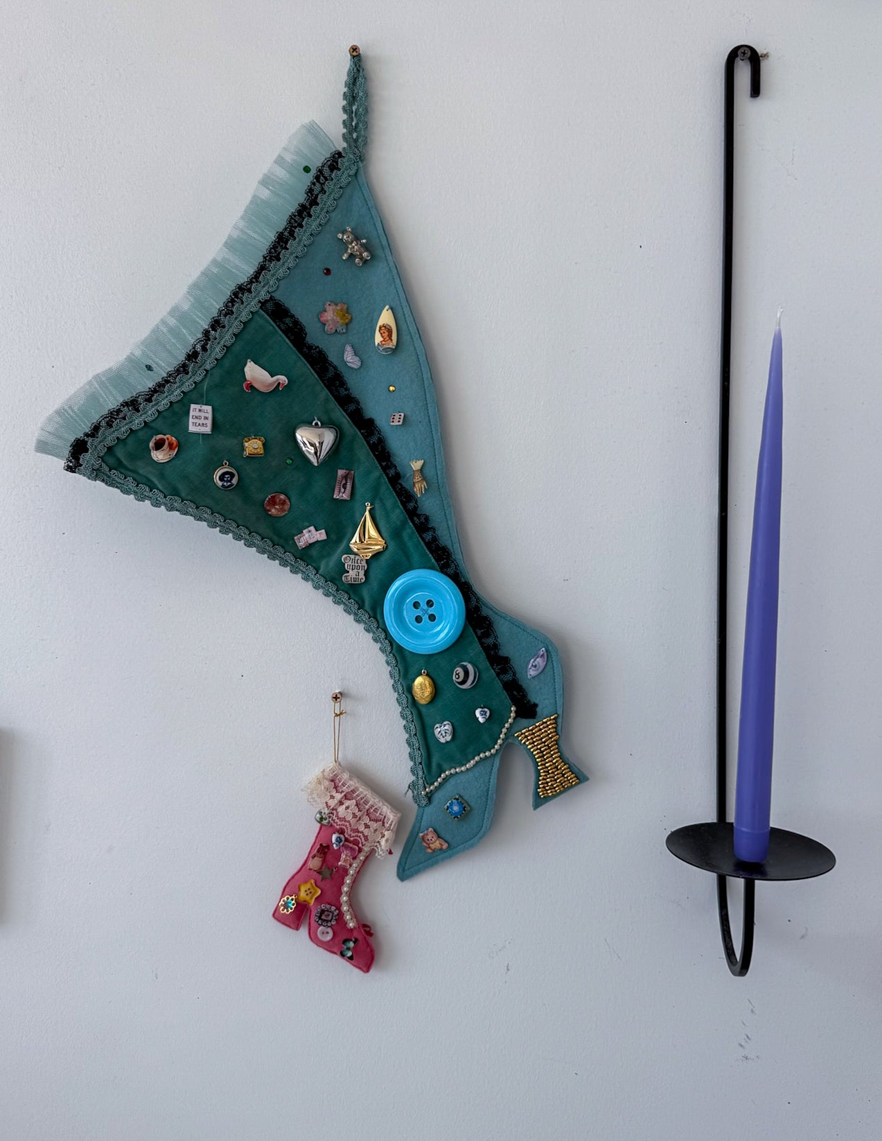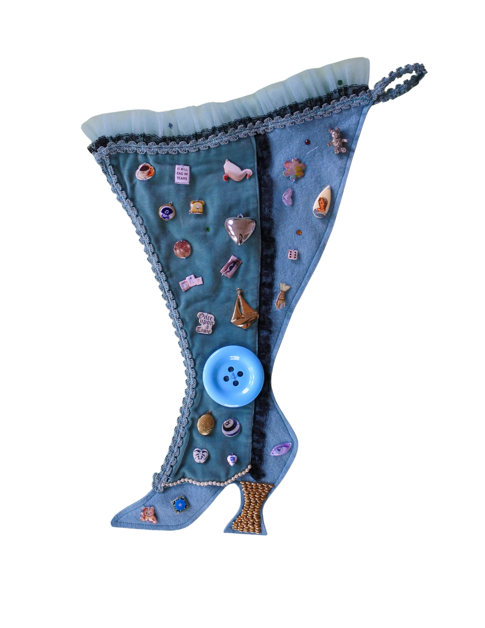 One-of-a-kind vintage stocking, adorned with our signature Picto-Charms™ and vintage findings by hand.