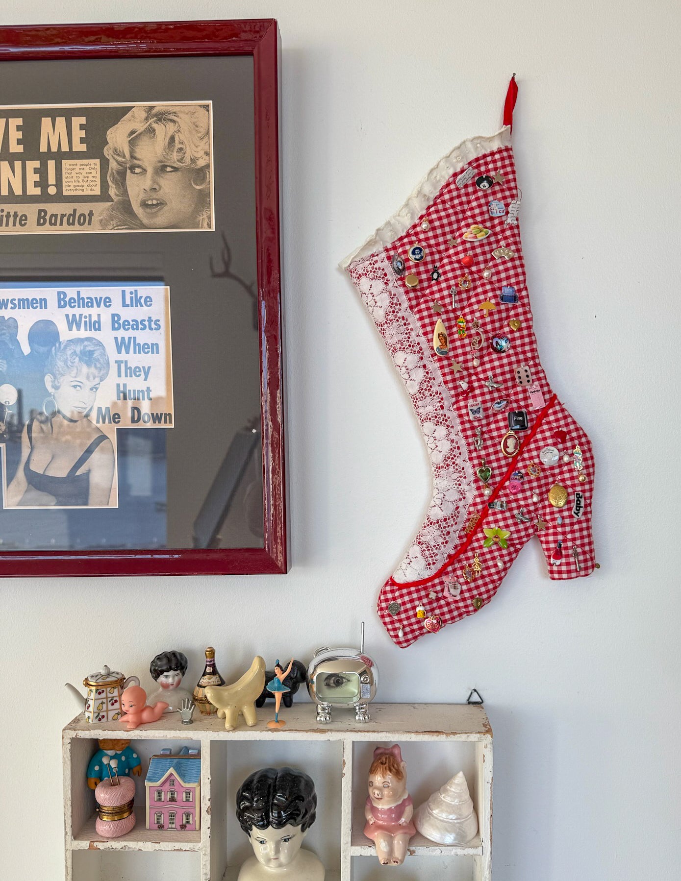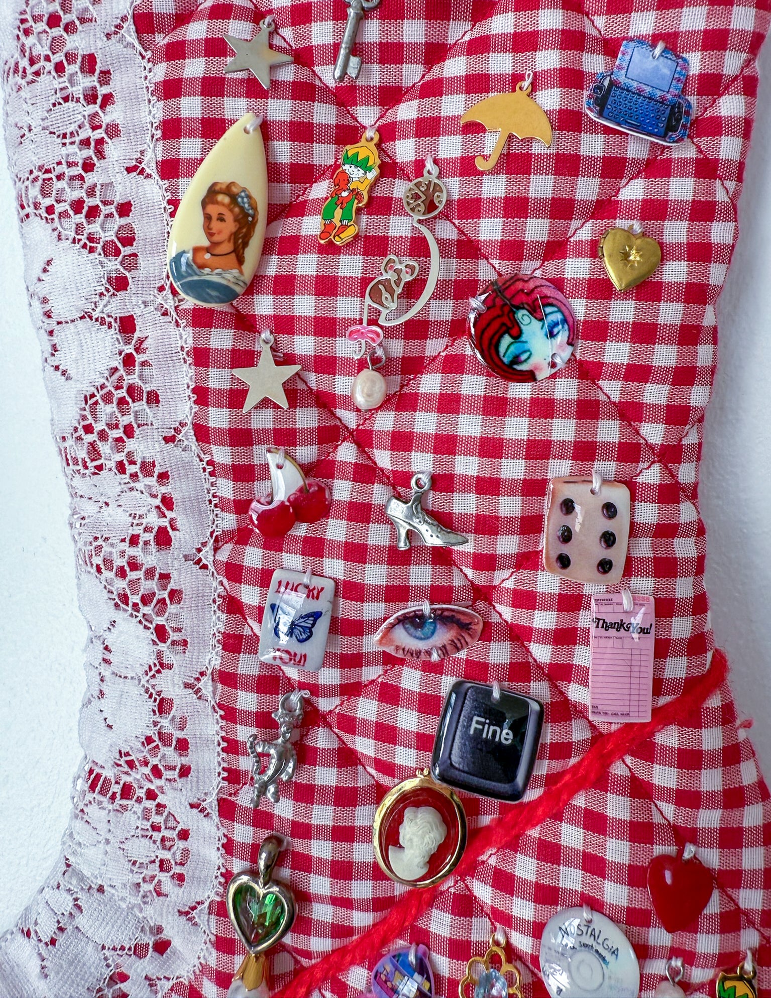 One-of-a-kind vintage stocking, adorned with our signature Picto-Charms™ and vintage findings by hand.