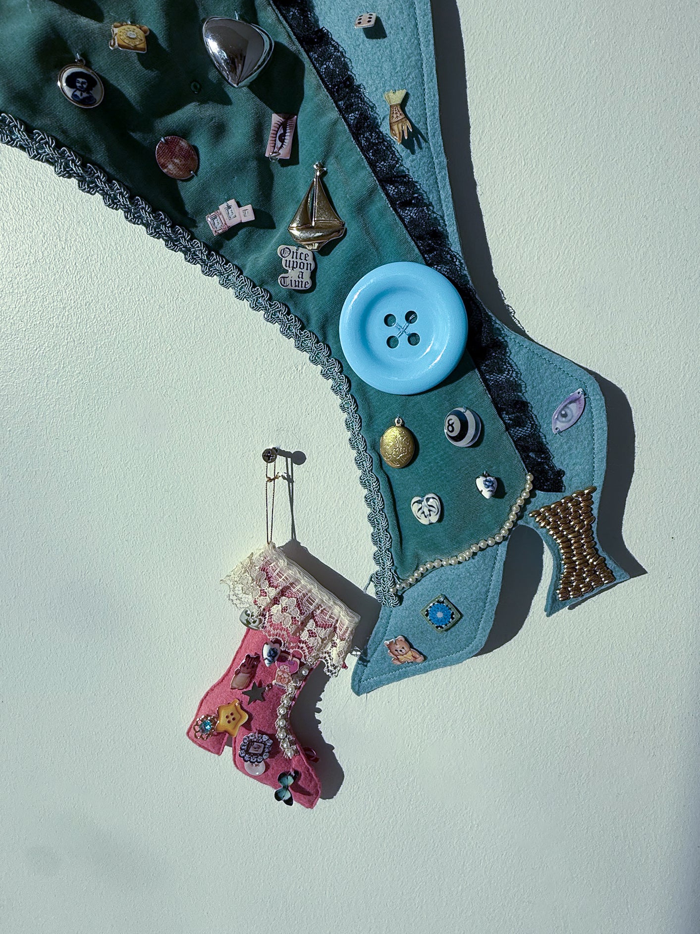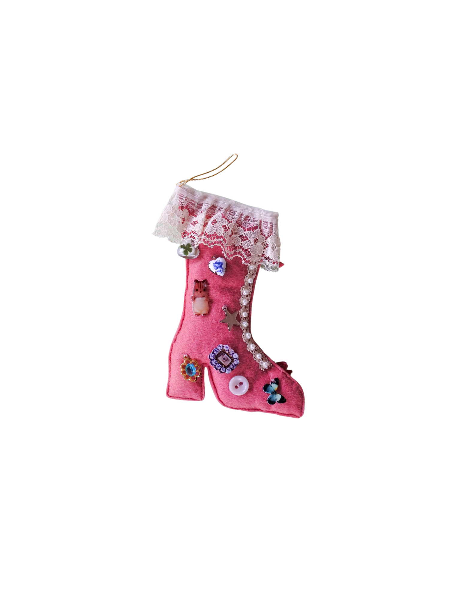 One-of-a-kind vintage stocking, adorned with our signature Picto-Charms™ and vintage findings by hand.