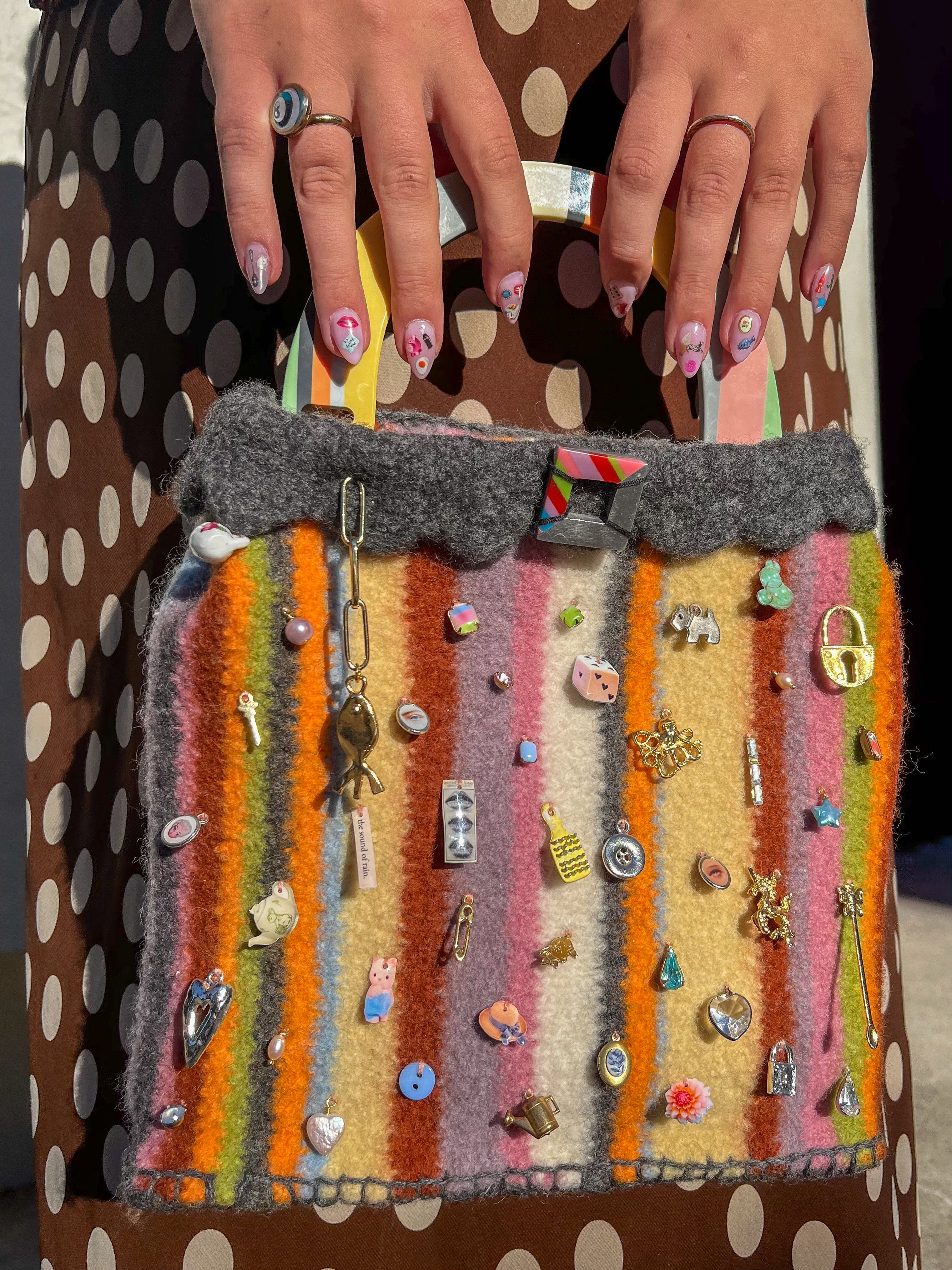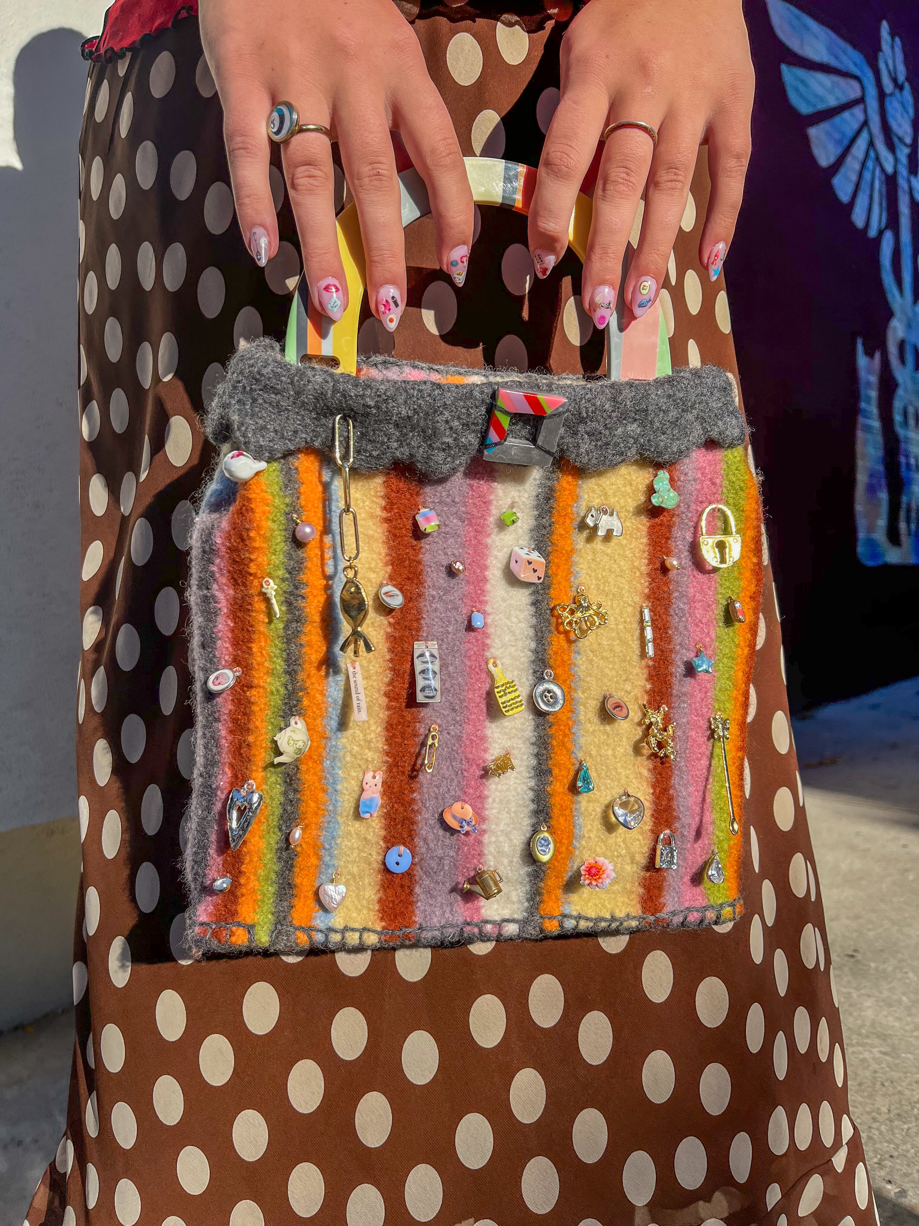 One-of-a-kind vintage reworked bag designed and embellished by Kelsey Armstrong with signature picto-charms™ and vintage findings.