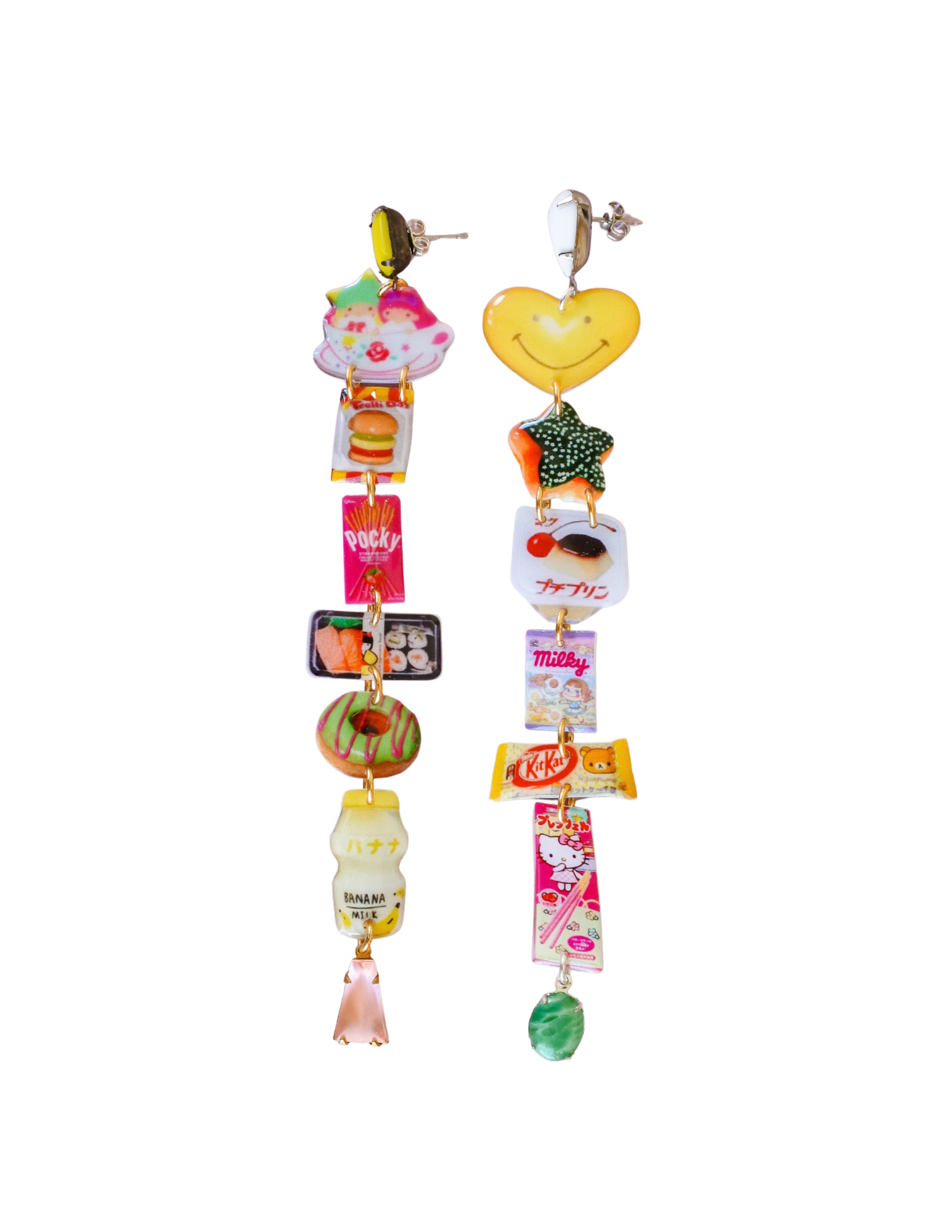 One-of-a-kind dangle set designed by the beans with signature picto-charms™, vintage findings, and finished with hypoallergenic hardware.