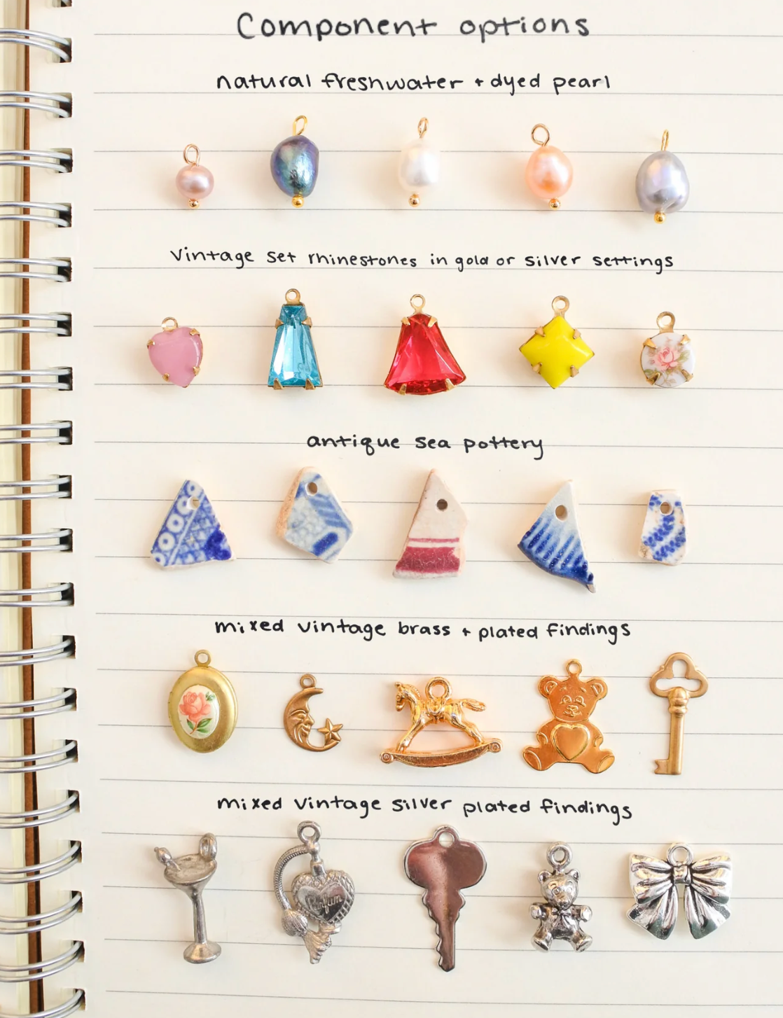 Due to the nature of this hand-crafted production, charms & vintage components will vary slightly in size & look between pieces, making each one unique. We will use our artistic discretion to decide the placement of your charms* & the vintage components we use based on your selections & what is in stock. Haricot Vert celebrates the particularity and uniqueness of each item we put out into the world. Think of it as a little surprise! :)