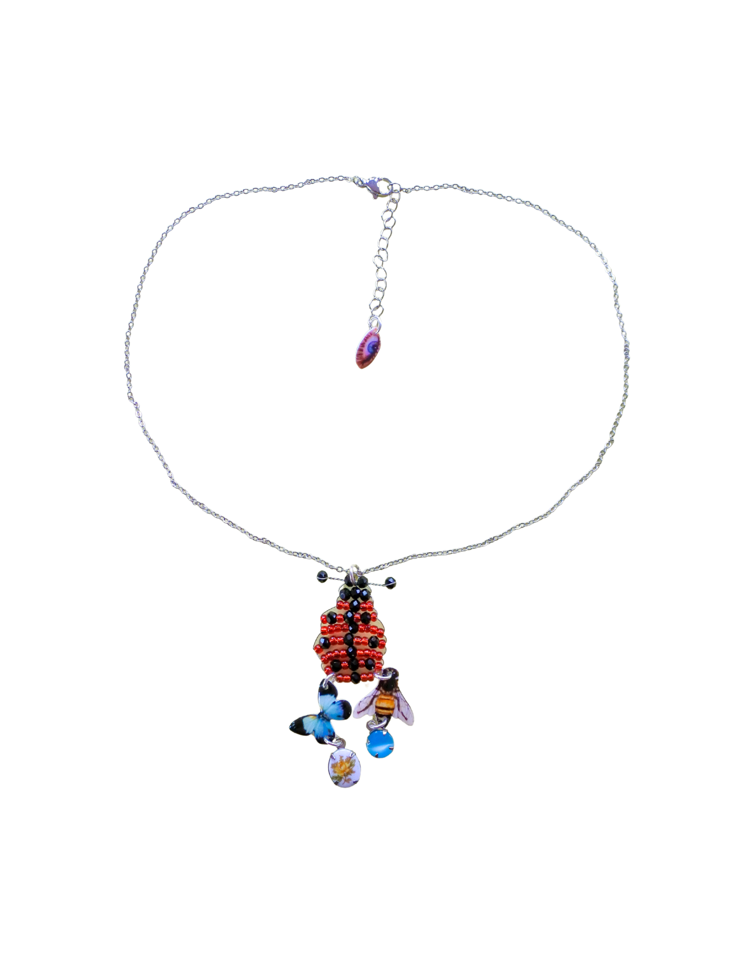 Materials: crafted by hand using polymer clay charms, picto-charms™, vintage stones, and sterling silver dainty chain.