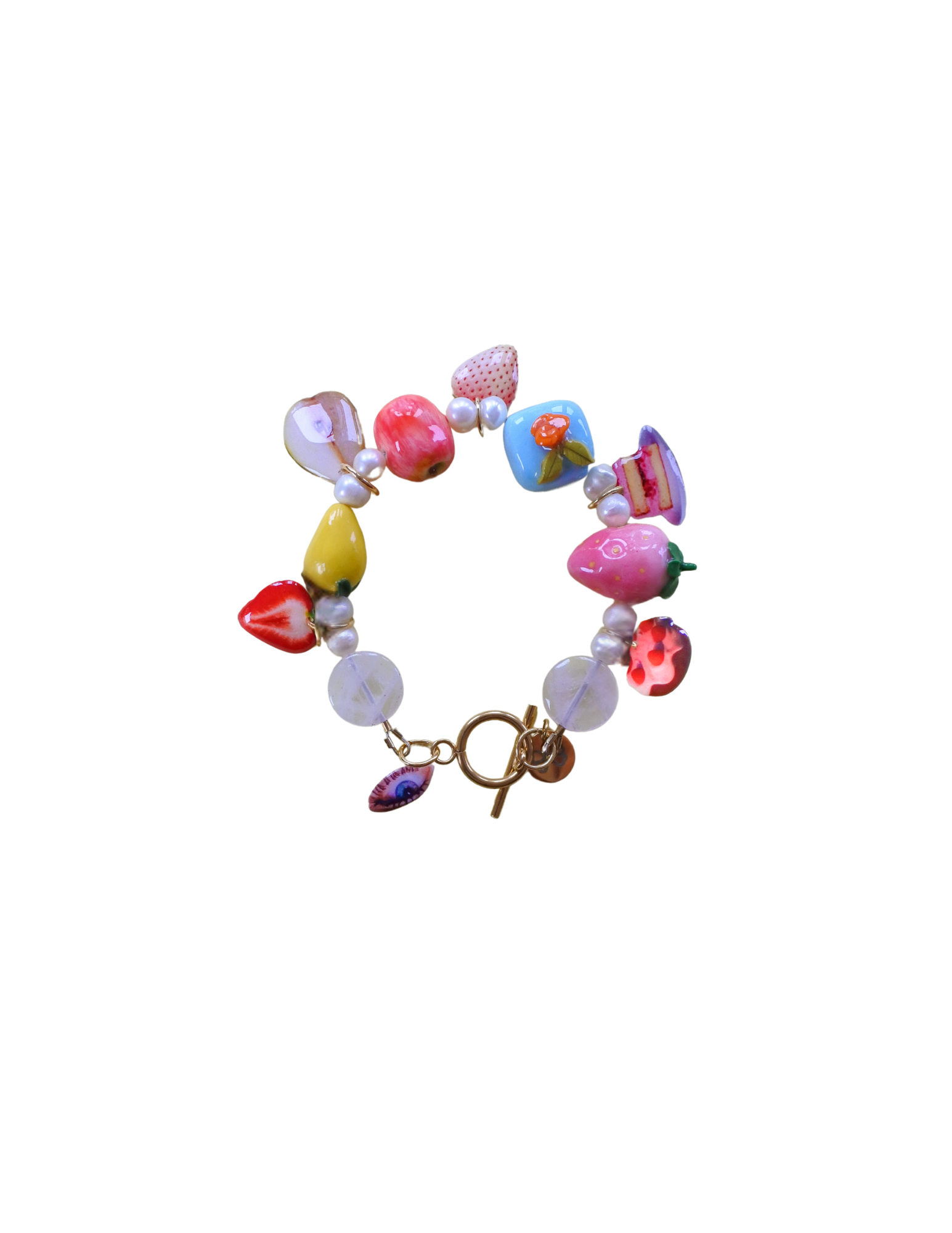 Materials: crafted by hand using polymer clay charms, beads, picto-charms™, and gold-plated hardware.