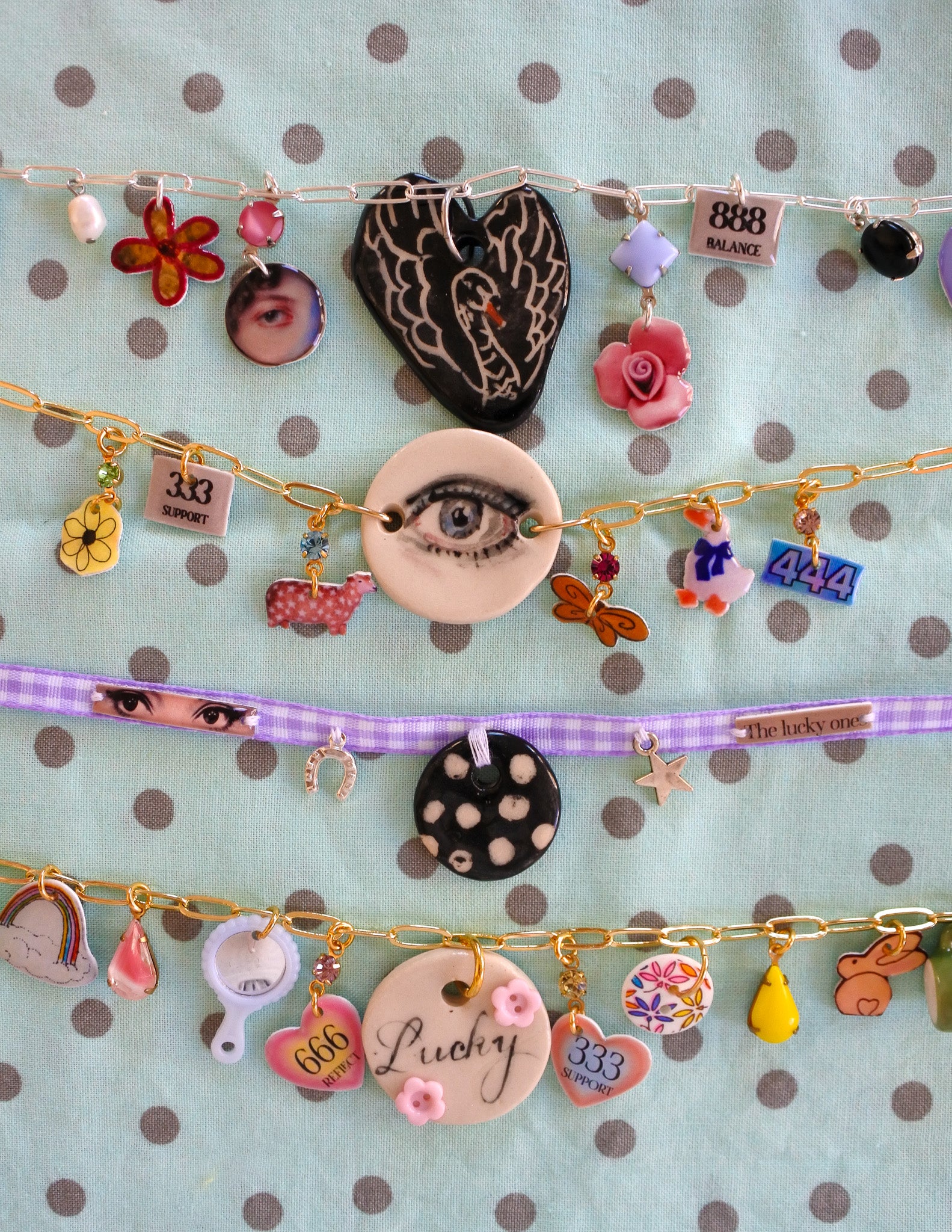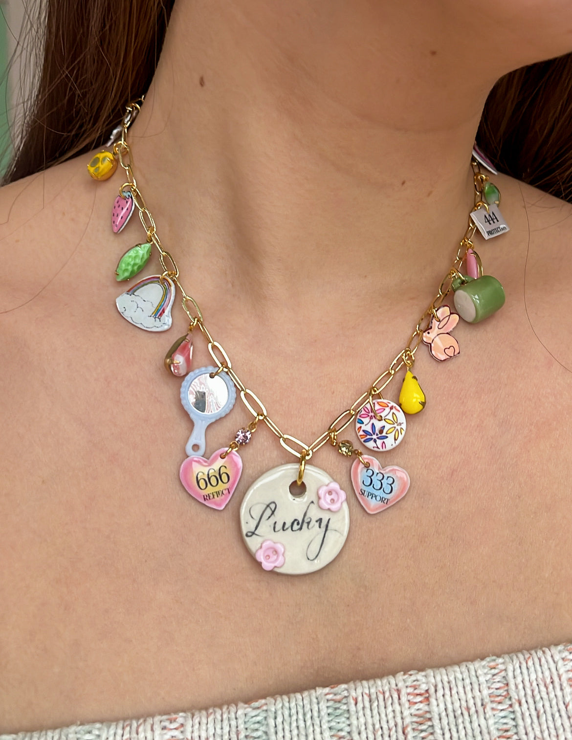 a one-of-a-kind necklace with ceramic pieces, thoughtfully handbuilt and hand-painted by ceramicsalyssa. this whimsical work features a gold necklace base adorned with handmade ceramics and haricot vert–inspired handmade picto-charms, paired with a curated mix of vintage and antique findings. a soulful, story-rich object made to bring charm and character to any space.
