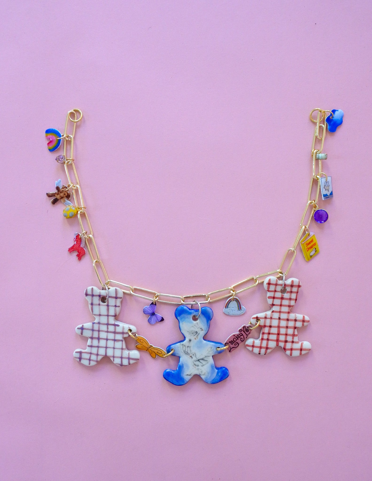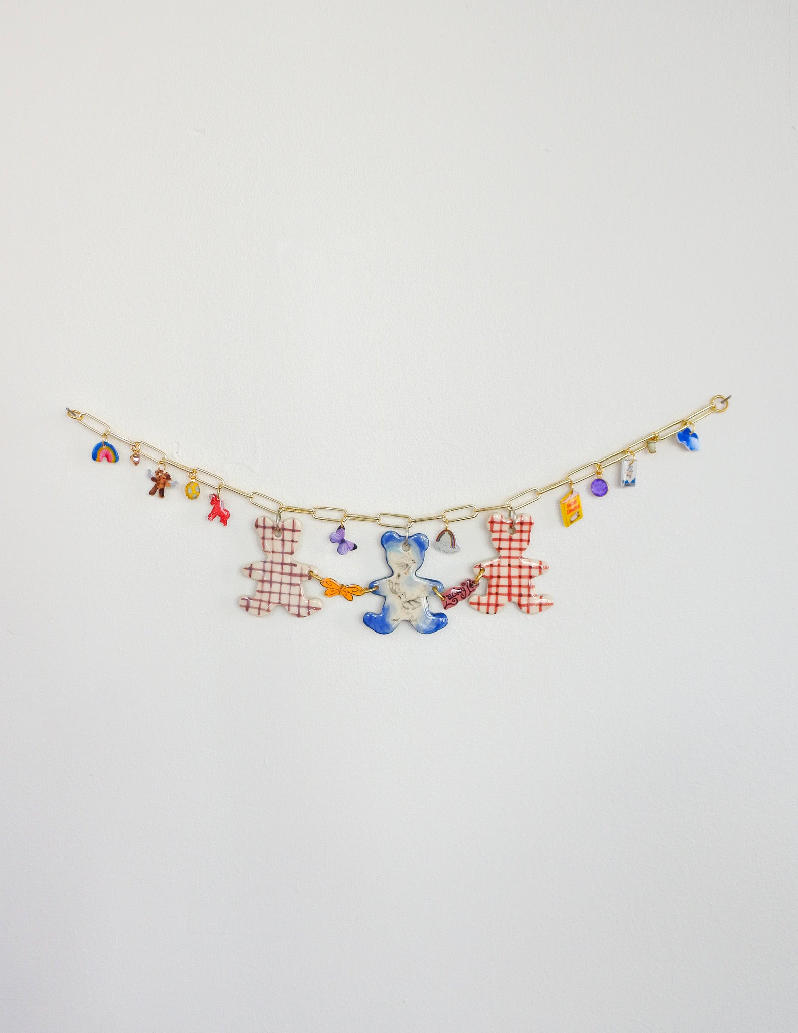 a one-of-a-kind wall hanging with ceramic pieces, thoughtfully handbuilt and hand-painted by ceramicsalyssa. this whimsical work features a gold-plated chain base adorned with handmade ceramics and haricot vert–inspired handmade picto-charms, paired with a curated mix of vintage and antique findings. a soulful, story-rich object made to bring charm and character to any space.