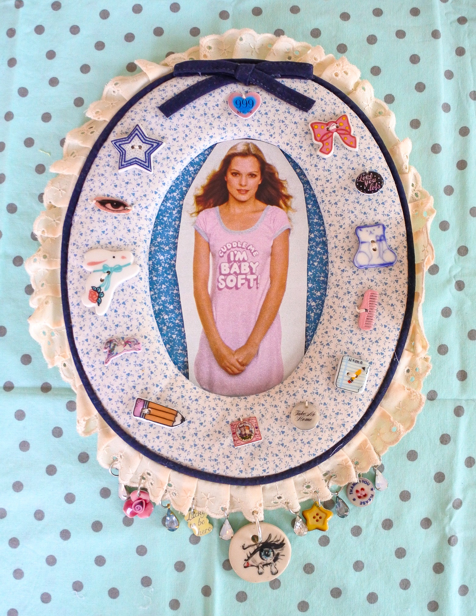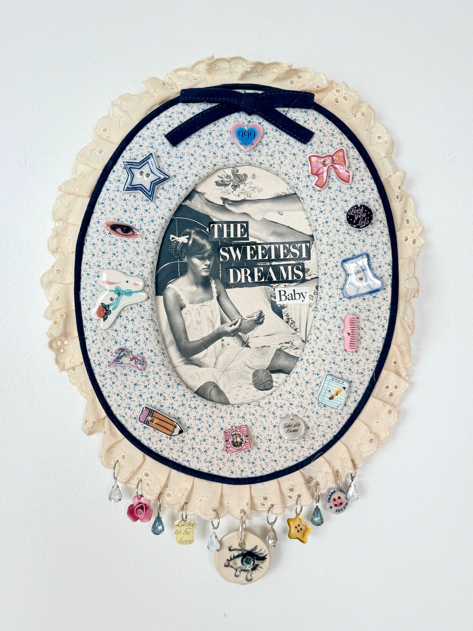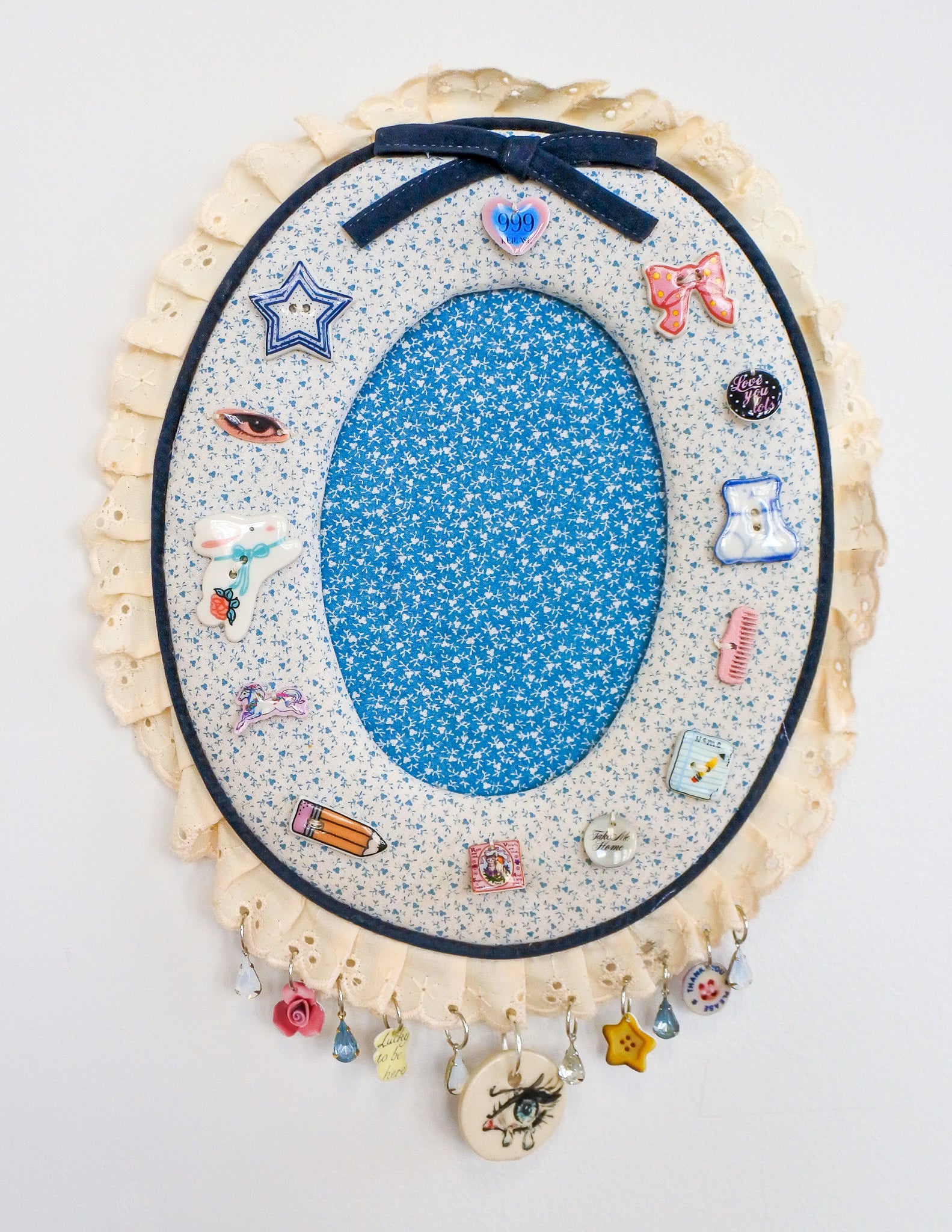 a one-of-a-kind vintage pillow frame. this whimsical work features an oval pillow frame adorned with thoughtfully handbuilt and hand-painted ceramics by ceramicsalyssa and haricot vert–inspired handmade picto-charms, paired with a curated mix of vintage and antique findings. a soulful, story-rich object made to bring charm and character to any space.