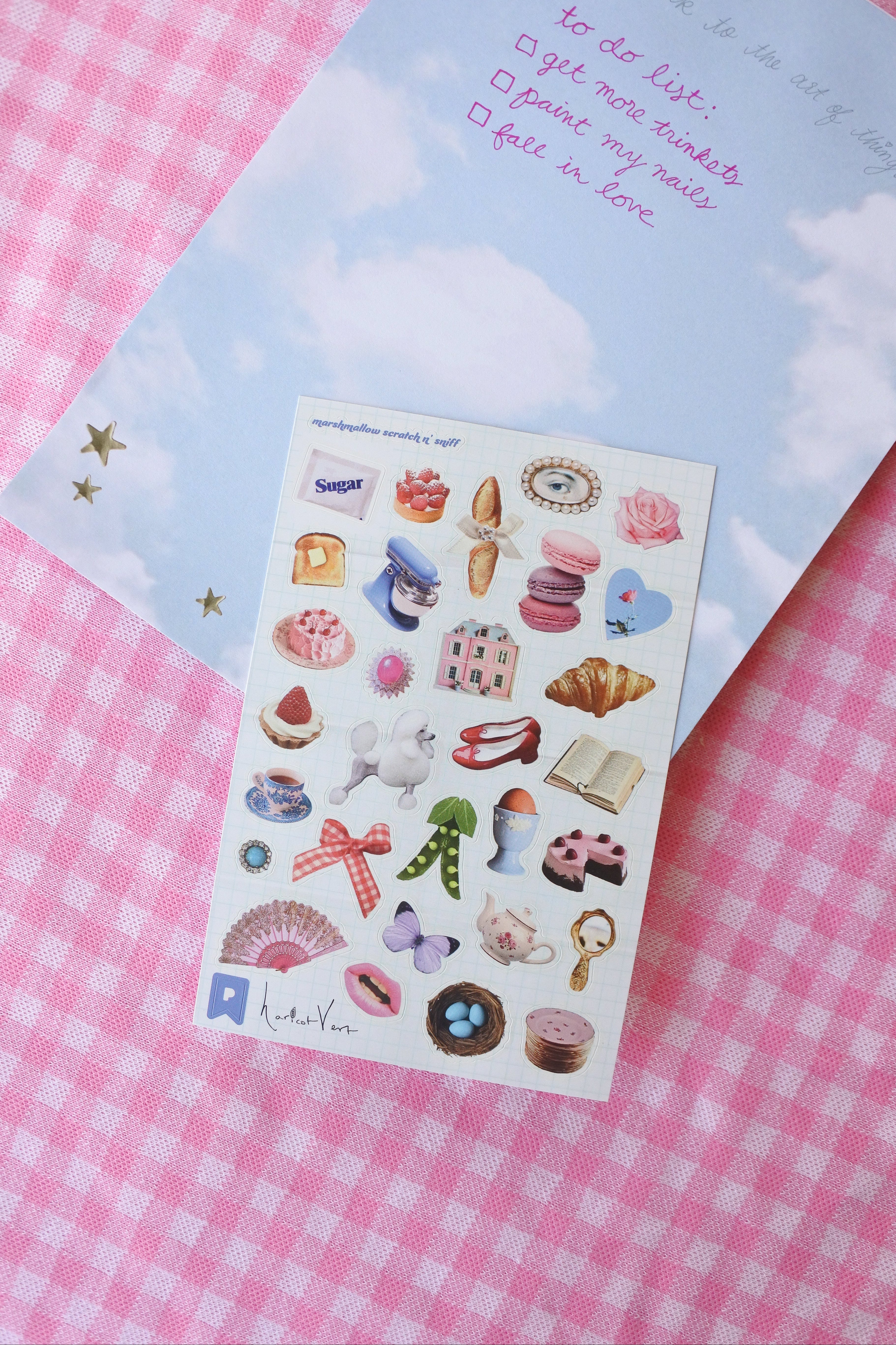 This product comes with 32 stickers that smell like marshmallows when you scratch them. Use these little treasures to accessorize your snail mail.