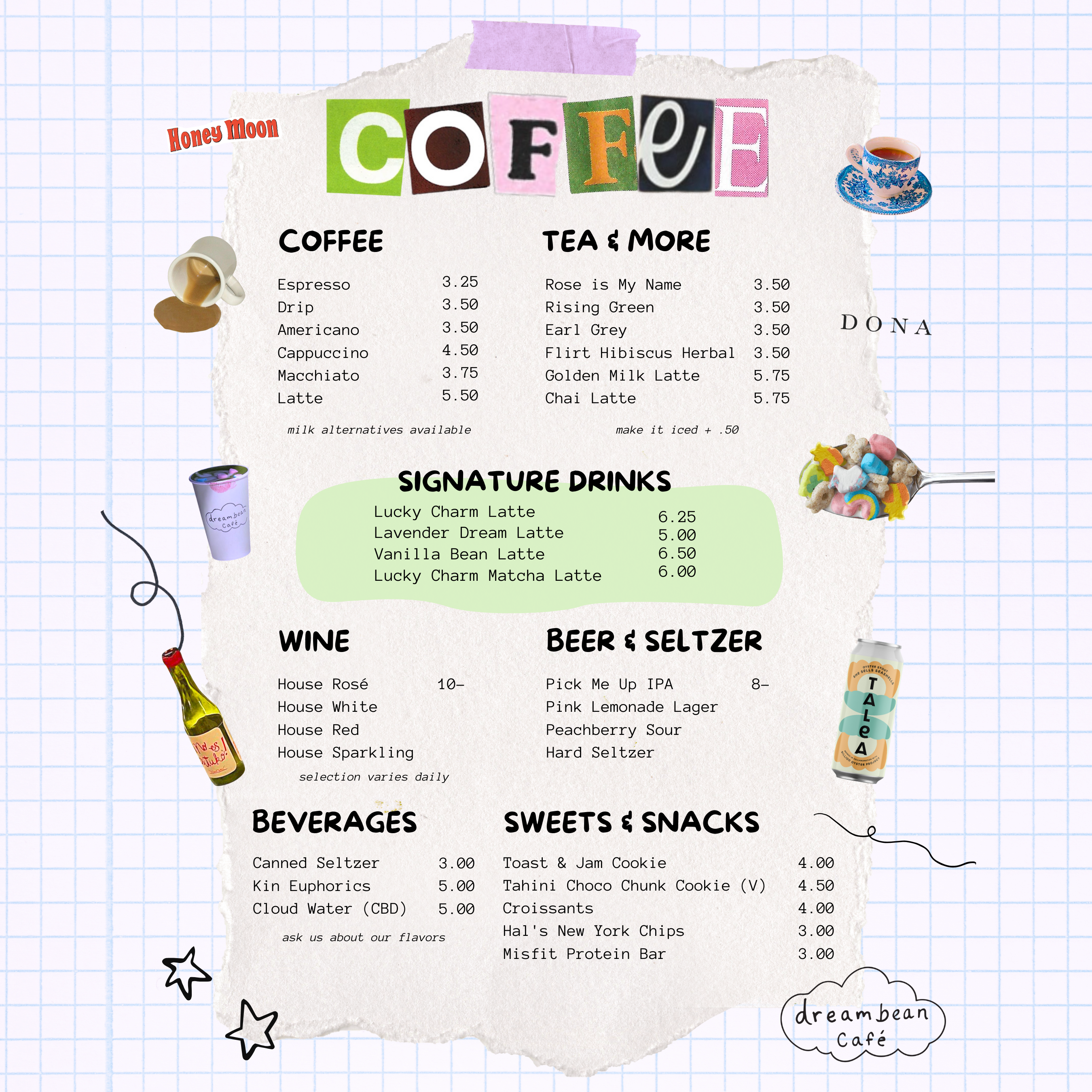 Nestled within Haricot Vert's charming brick-and-mortar boutique, the Dreambean Café is a cozy haven for delightful sips and treats. We proudly serve coffee from Honeymoon Roasters, tea by Dona, natural organic wine from local suppliers, and beer by Talea. Enjoy sweet treats from local bake artists, with surprise pop-ups from your favorite neighborhood bakers.
